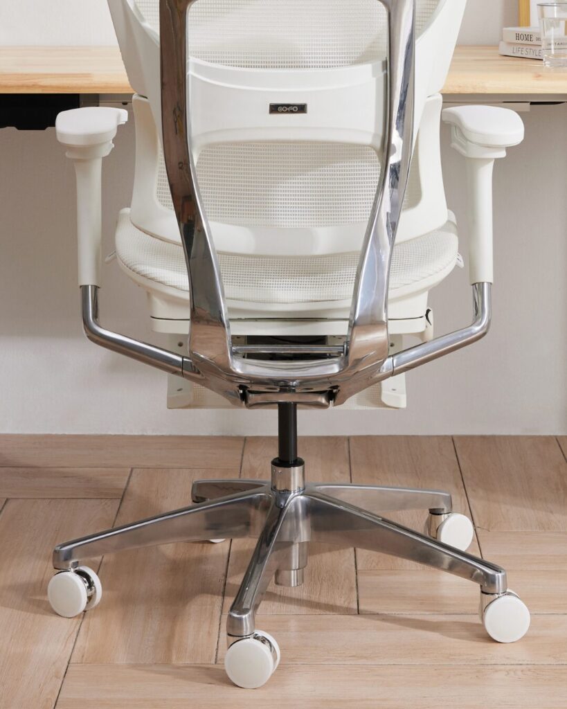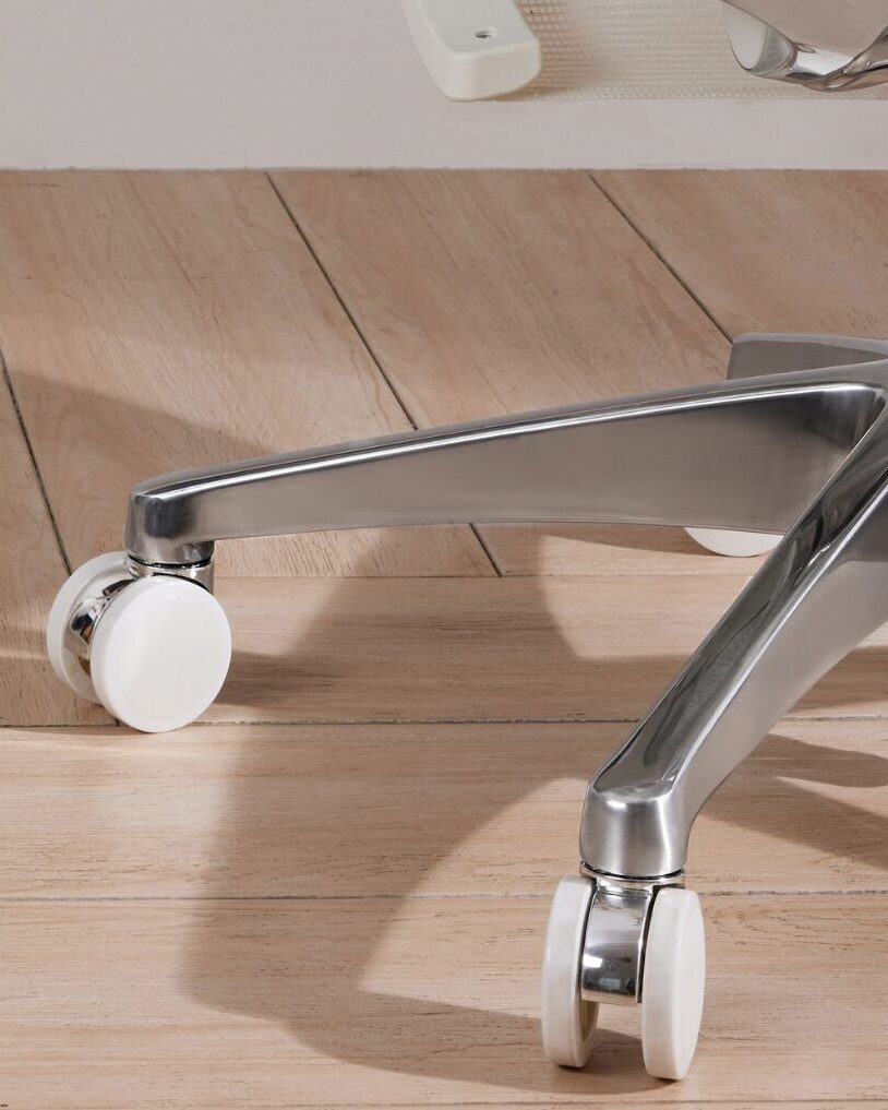 アルミフレームの重厚感あふれるボディであるものの、このキャスターのおかげで比較的軽い力でチェアを操作できるようになっています。