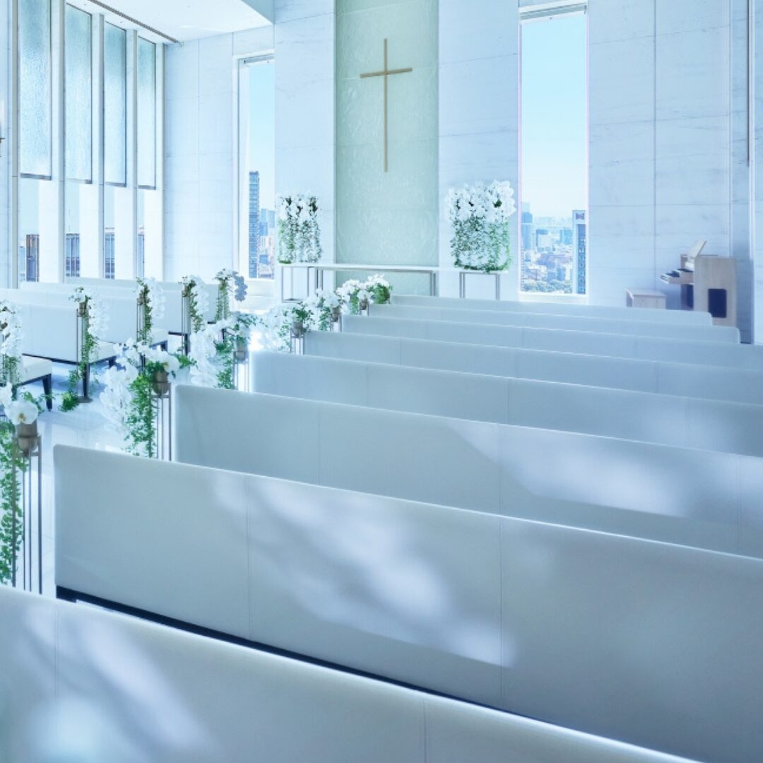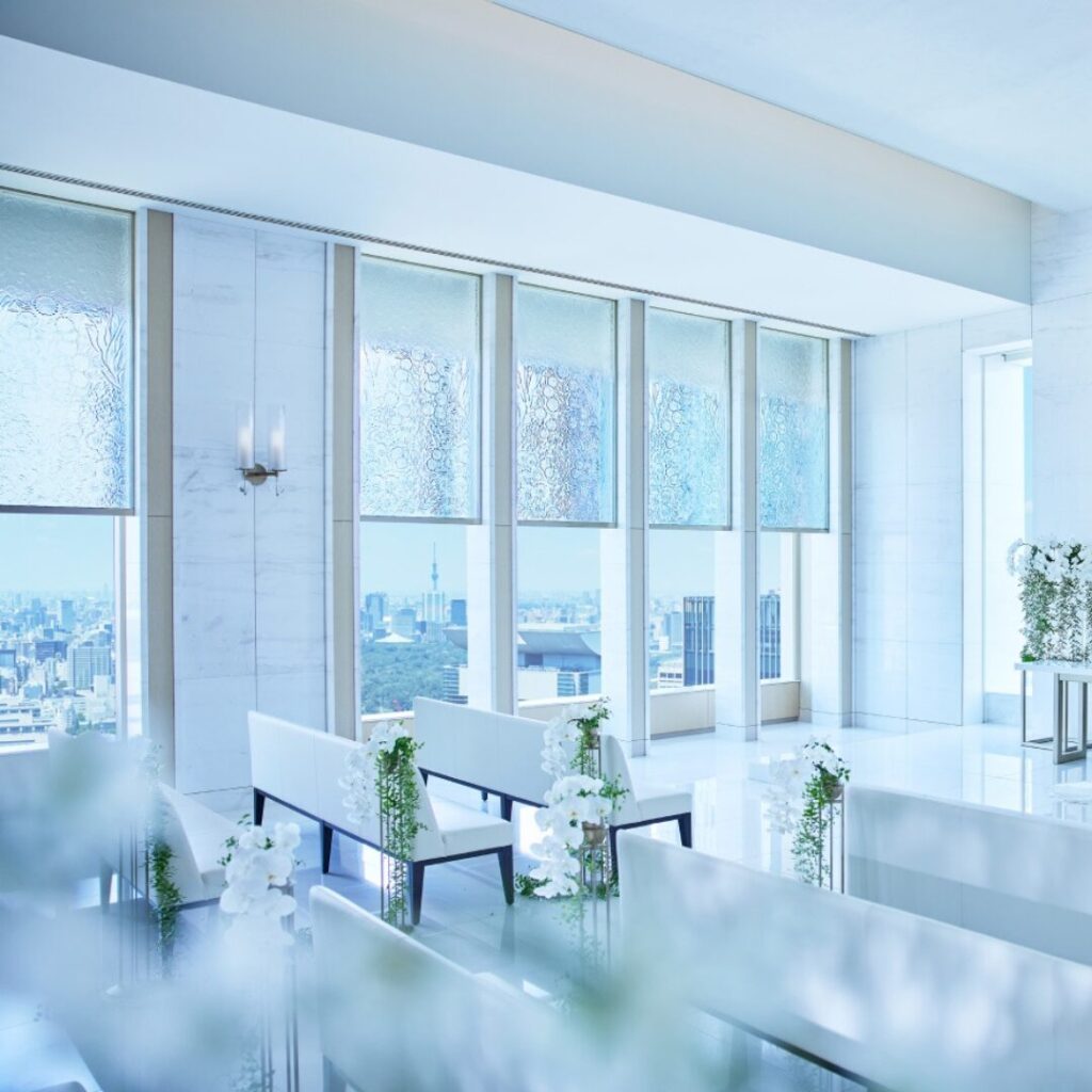 大きな窓から降りそそぐ自然光に包まれながら、感動的なせレモニーが実現できそうです。日が沈んだタイミングでの挙式も夜景が綺麗に見えるので素敵かもしれません。さらに、41階の最上階に位置しているので、天空をイメージした清潔感のある白を基調とした空間で、まるで空中に浮いているかのような会場でした。花嫁衣裳に用いるレースのように繊細なタッチで描かれた、空間を華やかに包み込むガラス装飾も、日光が入ると綺麗に輝きそうです。