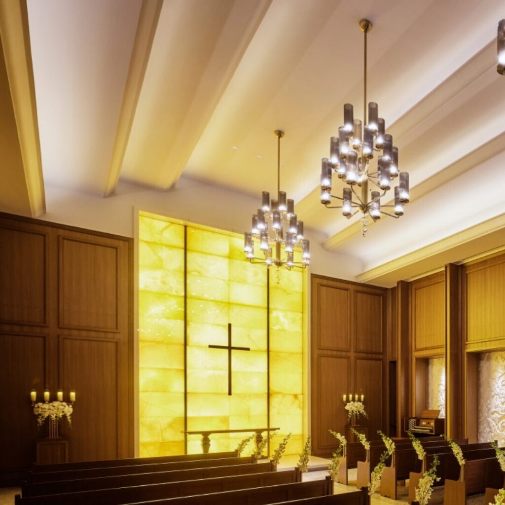 イエローオニキスの光壁が特徴のチャペル。夫婦の愛をまもると言われる天然石イエローオニキスの光の効果によりバージンロードに映るシルエットがとても魅力的でした。そして圧巻の7mの高い天井に配された大きなガラスのペンダントライトとウッディなインテリアが融合し、モダンな美を演出しています。チャペルに隣接するゲスト専用のウェルカムルームも完備されていて、自然光が射し込む空間でくつろいでゲストの方にもリラックスして待ってもらえそうです。