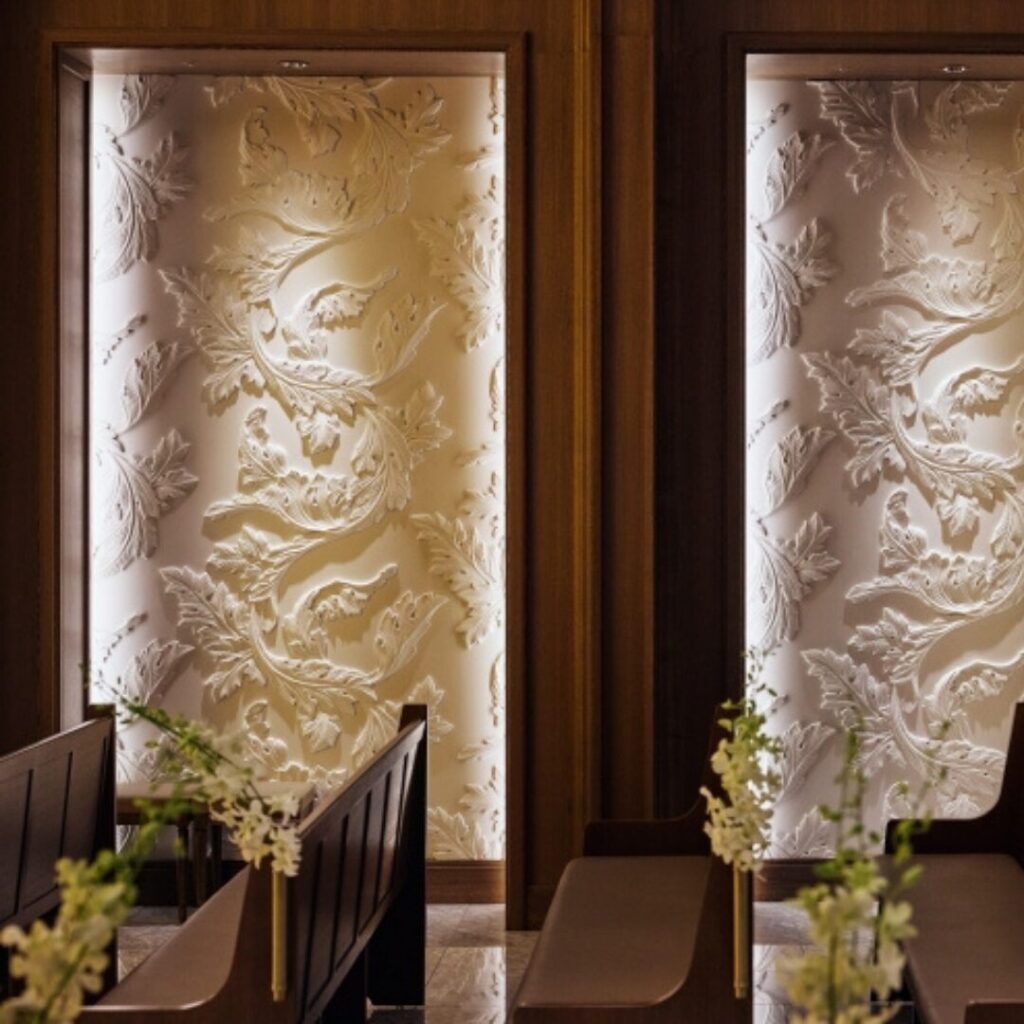 創業時より宴会場にあしらわれていた鱗(うろこ)文様の陶版アートをリデザインした壁面が華麗な中宴会場。和装はもちろんのこと洋装も映えるオークラらしい洗練された佇まいです。
